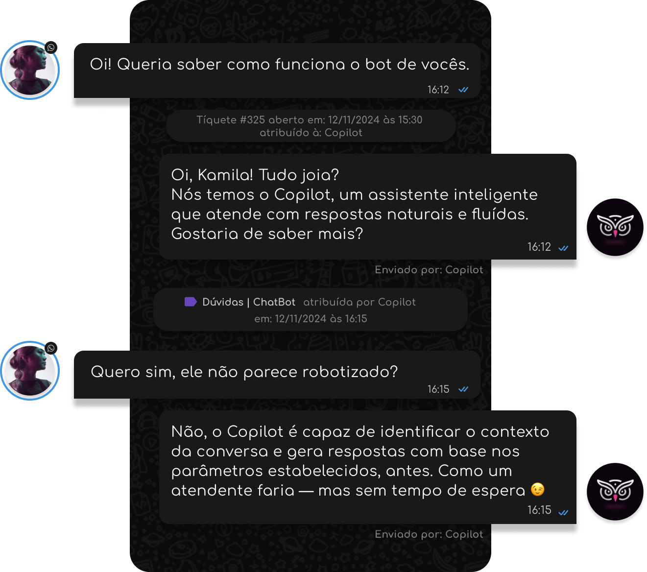 O Copilot Ă© mais do que um bot: ele entende a dĂșvida, identifica a intenção e responde de forma fluĂda, como um humano. Ativo 24h, ele tira dĂșvidas, encaminha o atendimento e ainda aprende com cada conversa.